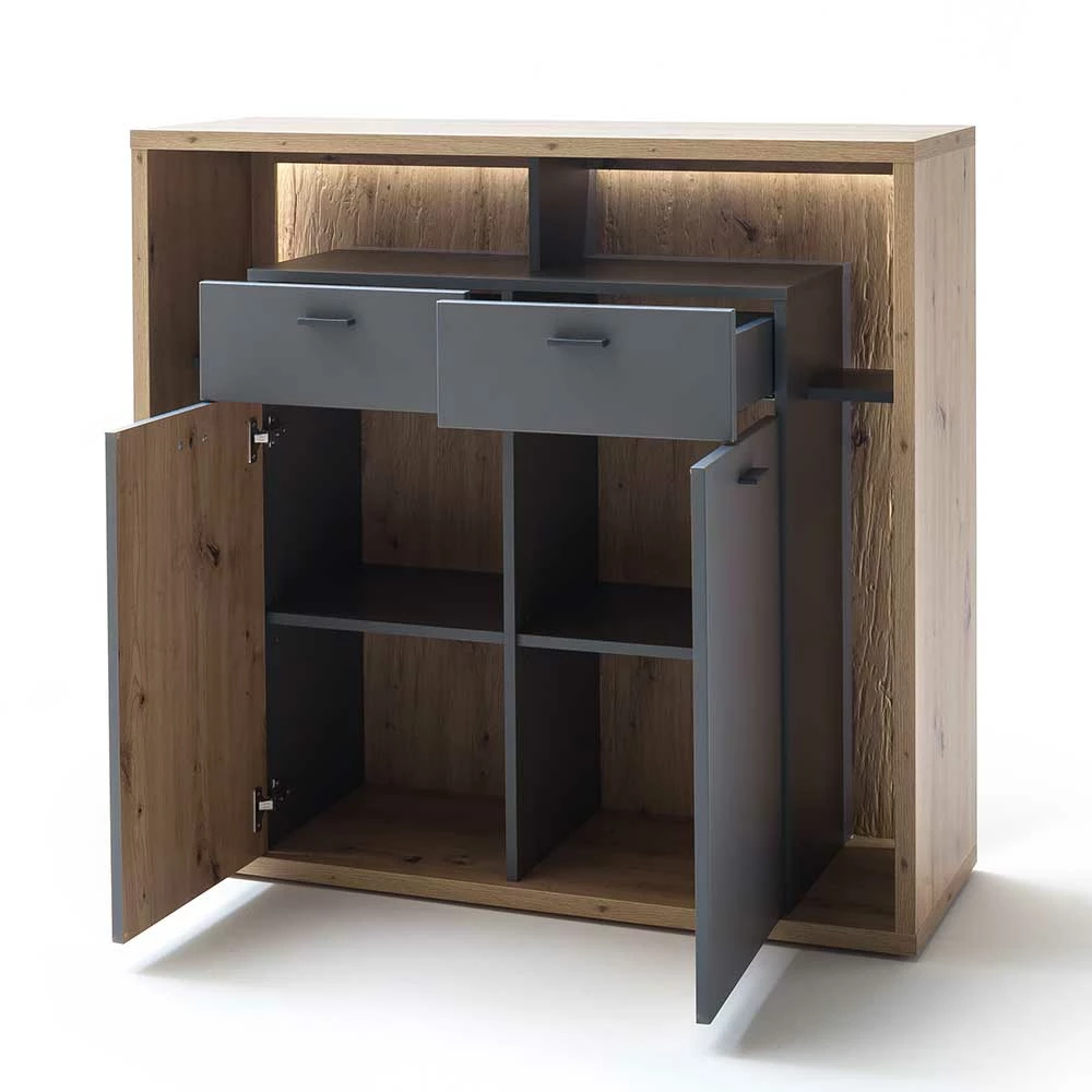 - Ansprechendes Highboard in Eichefarben und matt Grau
