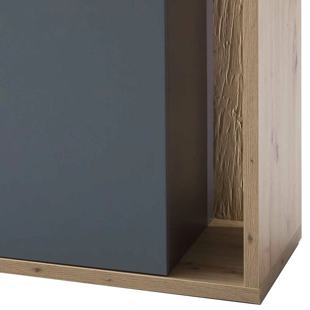 - Oberflächen in Holzoptik Balkeneiche melaminbeschichtet, Rückwand in 3D Optik gestaltet, mattgraue Flächen tiefgezogen foliert