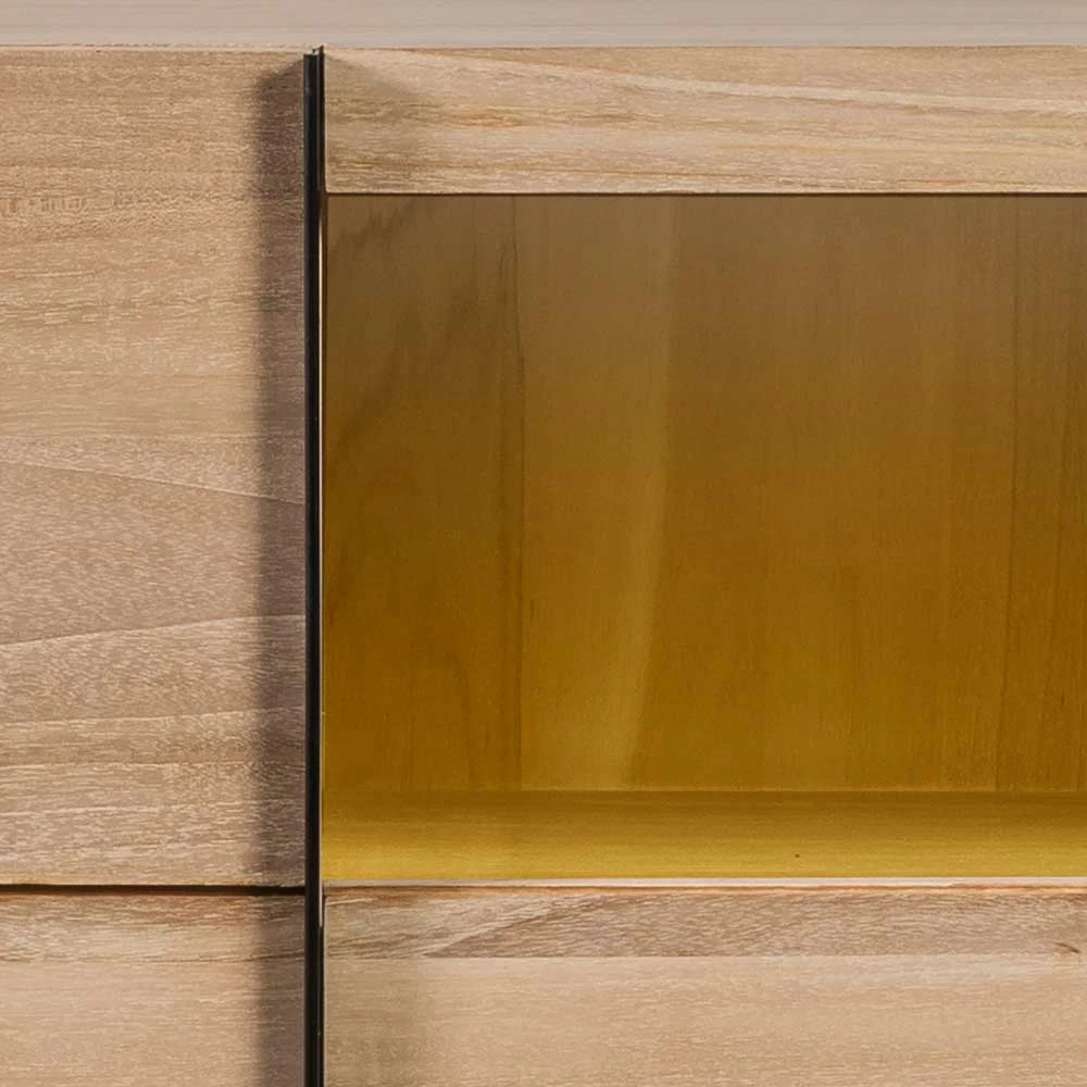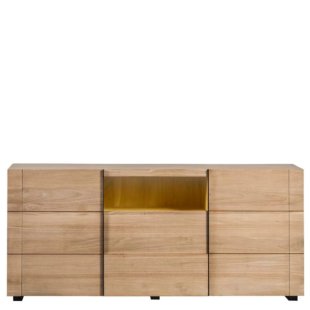 - Hergestellt aus massivem Teakholz (Front, Gestell) und mehrfach verleimtem Schichtholz (Korpus, Einlegeböden)