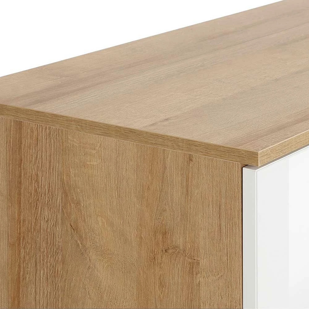 - Oberflächen kratzfest melaminbeschichtet in Holzoptik Eiche, Front mit Glas in Weiß beschichtet