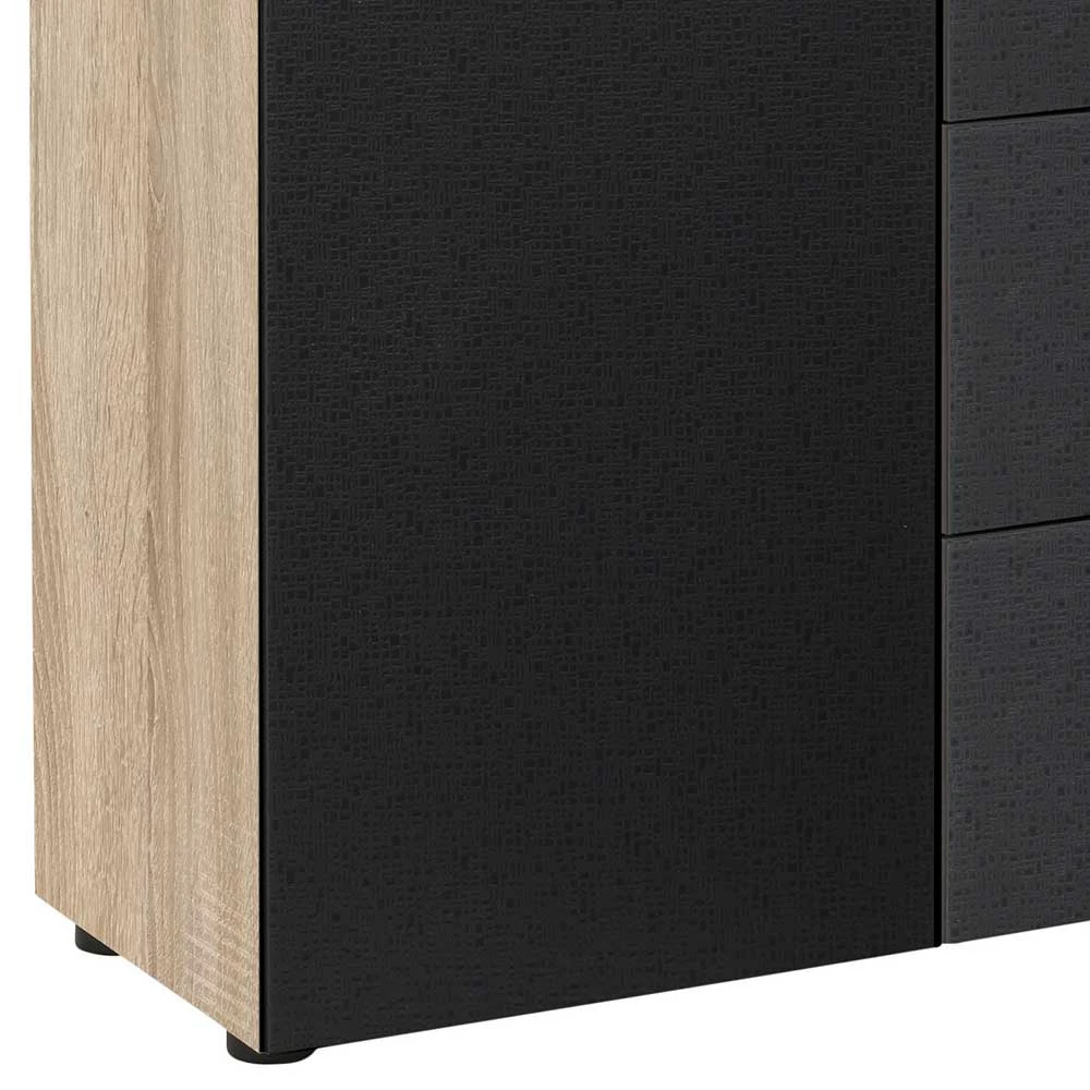 - Oberflächen kratzfest melaminbeschichtet in Holzoptik Sonoma Eiche, Front mit strukturiertem Glas und Deckplatte mit Einscheibensicherheitsglas in Anthrazit beschichtet