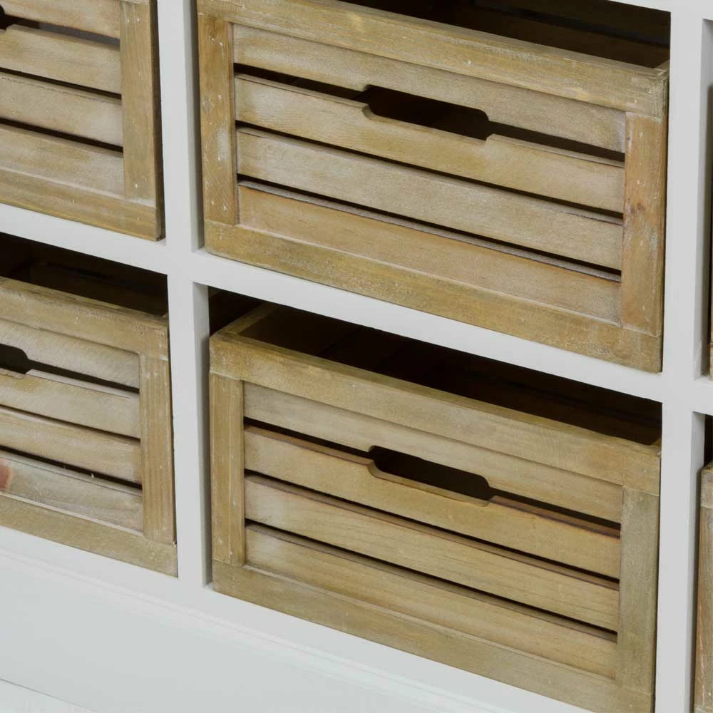 - Drei Schubladen auf Holzauszug und sechs Holzkörbe als Schubkasten mit praktischen Griffmulden