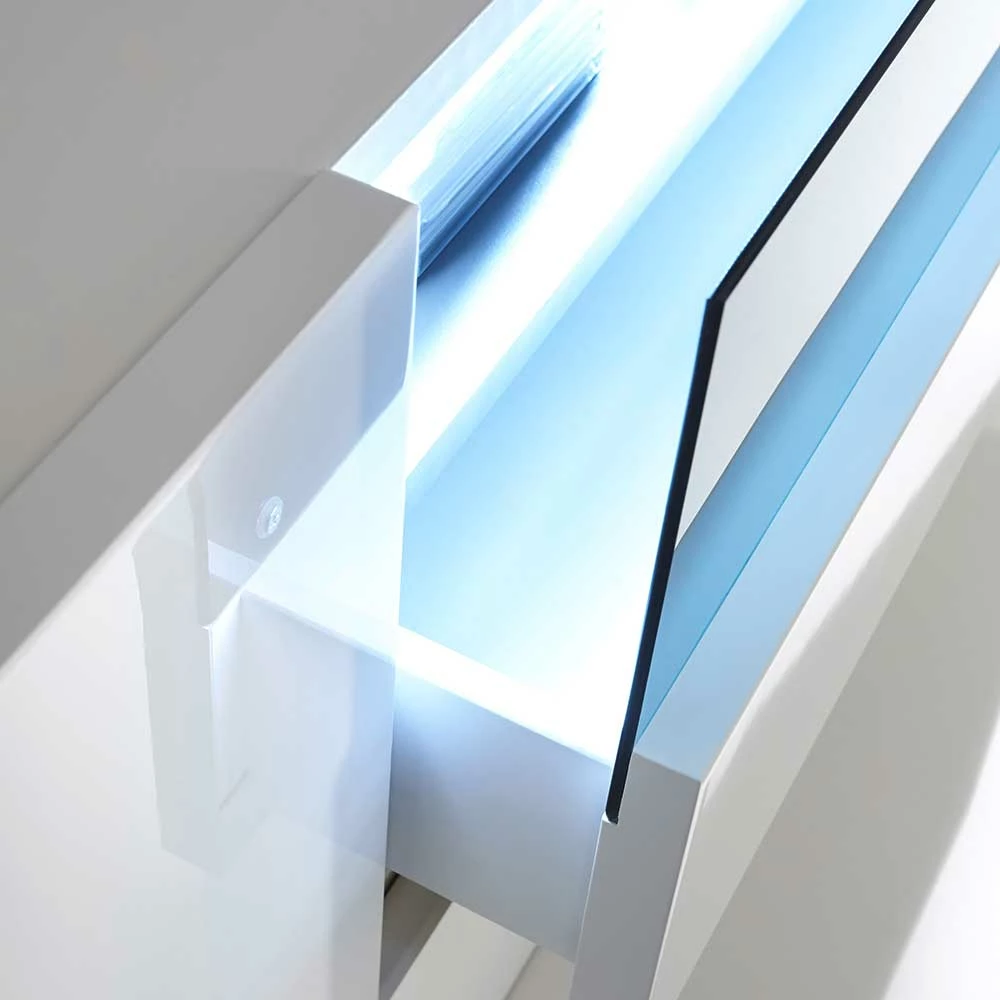- Weiße LED-Beleuchtung in dem transparenten Fach, wirkt durch das geschwärzte Glas bläulich