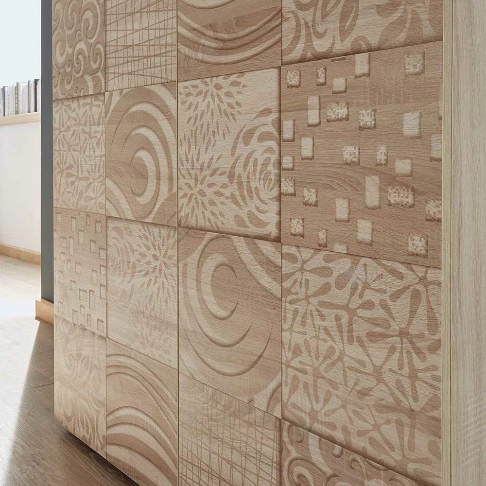 - Oberfläche in Holzoptik Sonoma Eiche foliert, Front mit aufwändigem Siebdruck gestaltet